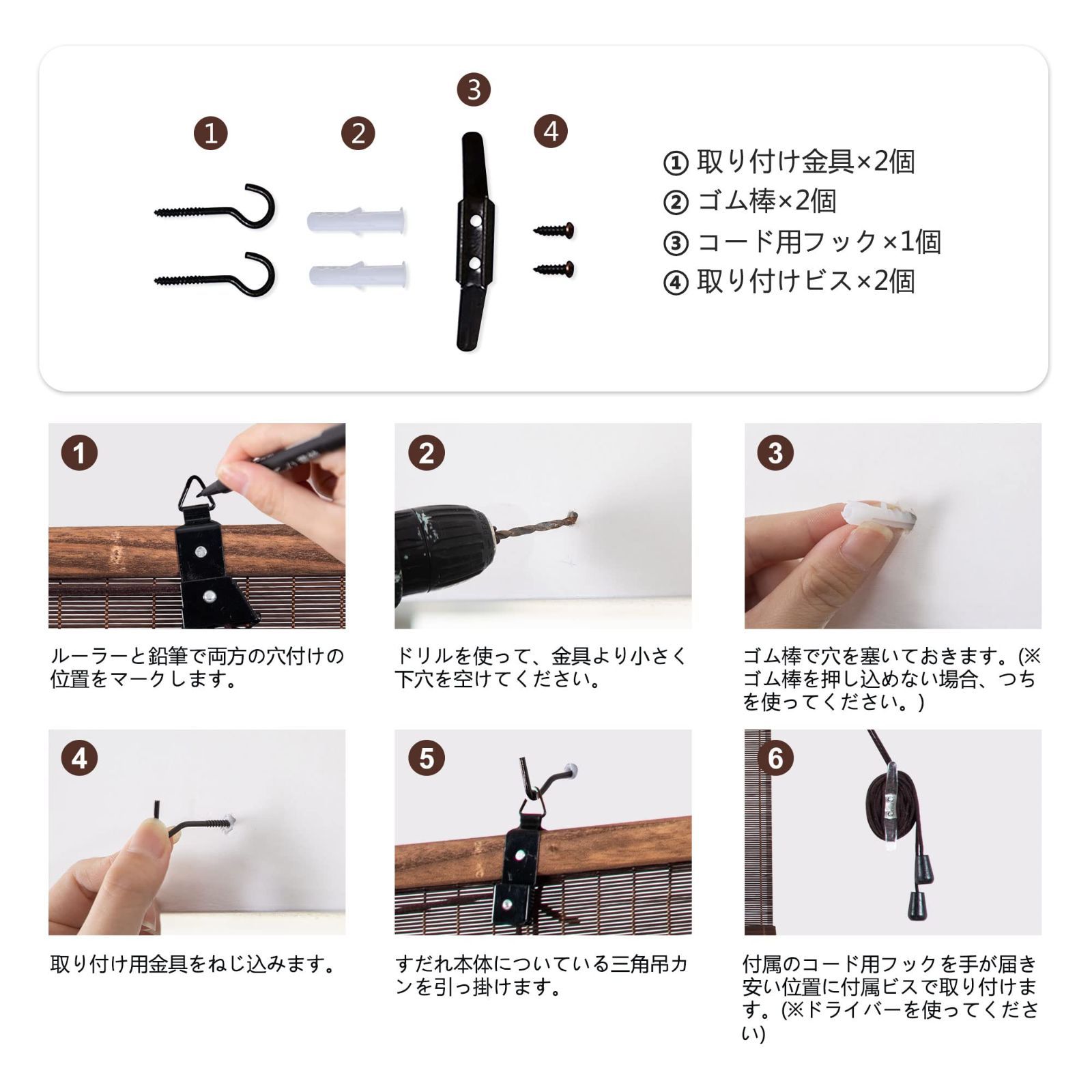 【取り付けが簡単】当社の竹ブラインドは、取り付けアクセサリーを含め、屋内および屋外の設置に適しています.ご注文の前に、設置タイプとサイズ情報を必ずご確認ください (設置図を参照)。