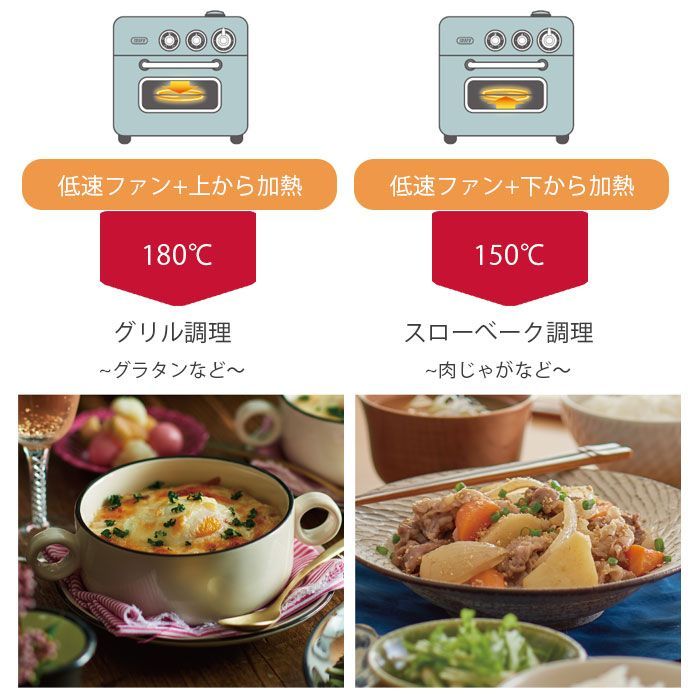 ノンフライ調理に加えて、オーブン調理、グリル調理、スローベーク調理、発酵までこなす充実の機能を搭載しています。トーストなどの普段使いから、本格調理まで幅広く活躍します。