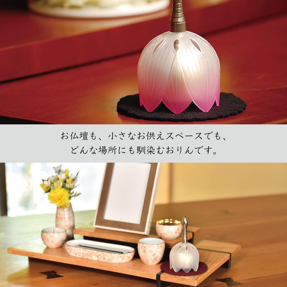 手で持って鳴らす、おしゃれなおりんです。まるで蓮の花を思わせる、従来のりんとは一線を画すデザインが人気です。仏具として、お仏壇でのご使用はもちろん、リビングのインテリアやベルとしてもご使用いただけます。
