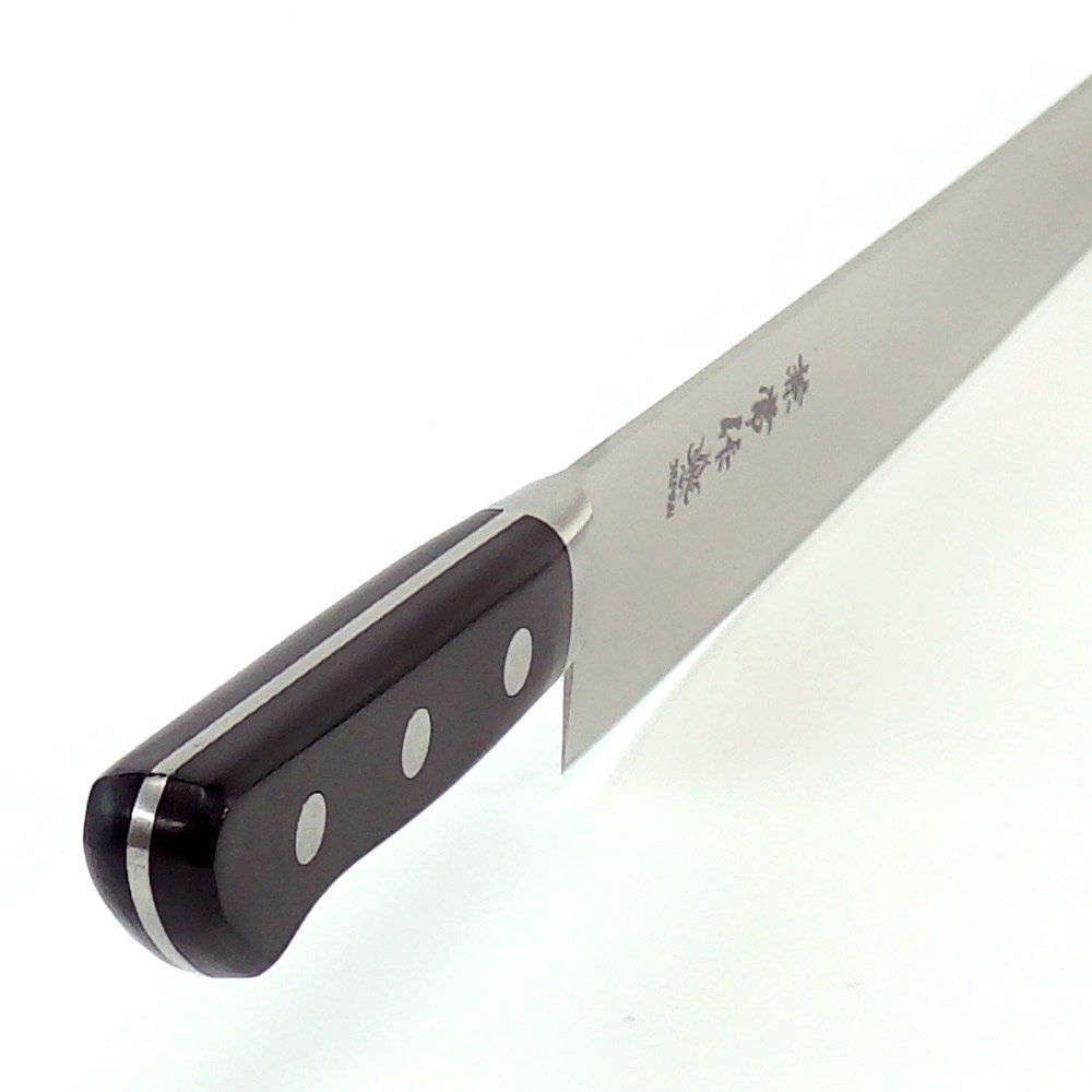 「筋引270mm」は、主に牛ヒレ肉の筋取りの際に細く長いブレードを生かして引き切りする際に適した特殊な形状のスタイルです。刺身の薄切りやカルパッチョなどの削ぎ切り、フルーツやスイーツ、サンドウィッチの切り分けにも便利です。