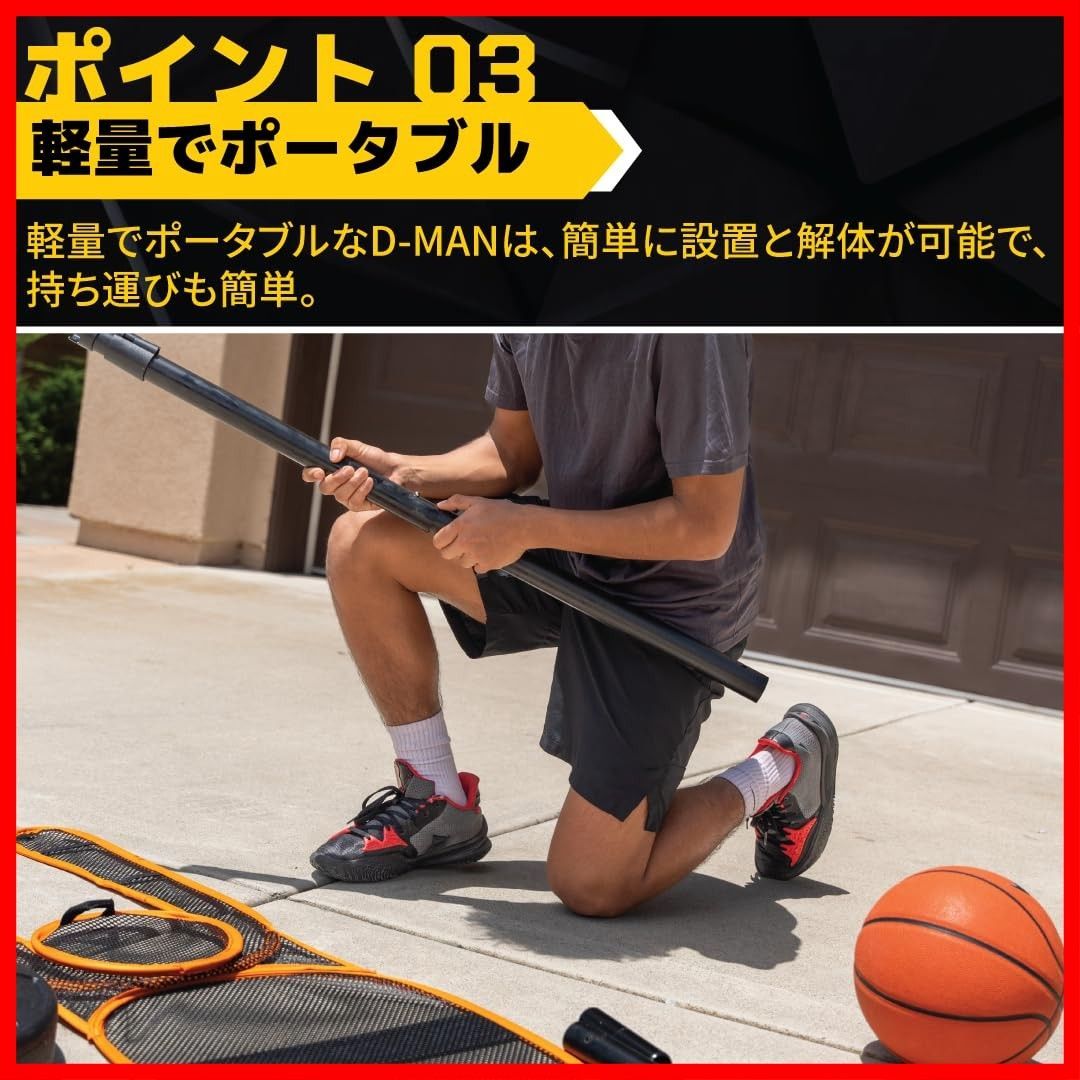 ハンズアップディフェンス: 練習ダミーが手を上げた状態で設置されるため、広いディフェンス範囲がカバーされた状況下でシュートやパスの練習を可能にします。D-MANはオフェンスで必要なドリブル、ボールハンドリング、シュート、パスのスキルを磨くのに役立ちます。