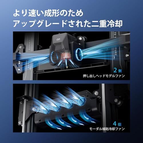 【効率的&即時冷却】強風を備えた 2 つの厚みのある両面 4015 モデル冷却ファンにより、より包括的かつ効率的な熱放散を実現します。また、プリントヘッドの後ろにある 4x4020 ボールベアリングブロワーファンは、新しく堆積されたモデルを素早く冷却し、非常に速い印刷速度でも良好な印刷品質を保証します。