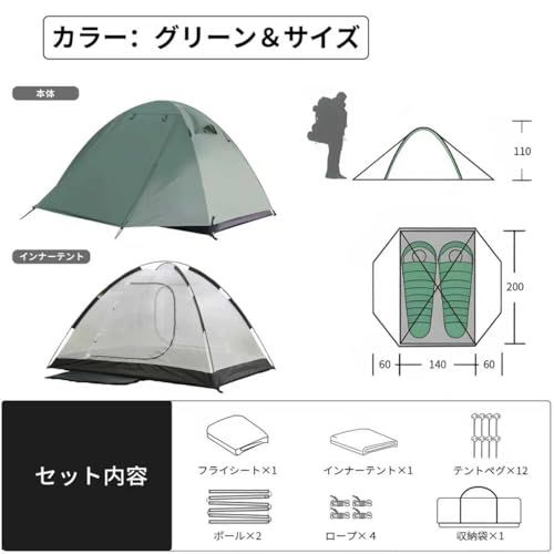 【機能的なデザインと広々空間】2つのドアと2つの前室、さらにキャノピーを備えた実用的な構造。 両サイドの前室には約60cmのスペースがあり、靴や荷物の保管にも便利です。トレッキングポールや木の枝を使えば、前室部分を簡易タープのように広げて日陰や雨除けスペースを作ることも可能。コンパクトに収納できるキャリーバッグ付きで、携帯性も抜群です。