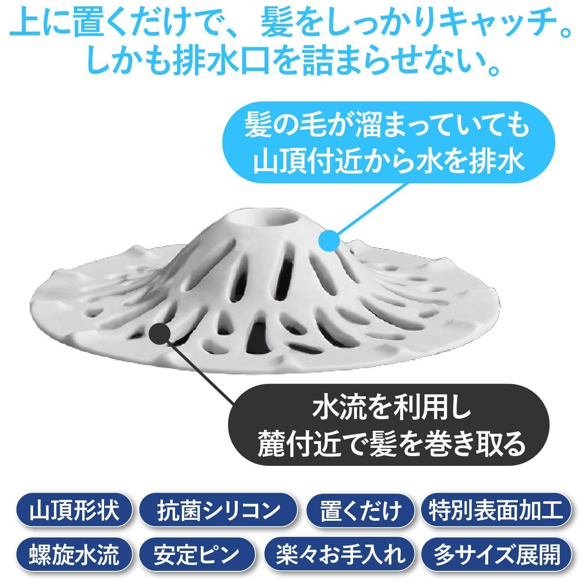 特徴 髪づまりしないヘアキャッチャー・山頂型デザインの誘う螺旋水流で排水もスムーズ 安定ピンで水に流されない。 お手入れ簡単 両面特殊加工でするっと髪がとれる。 銀イオン粒子含有抗菌シリコン