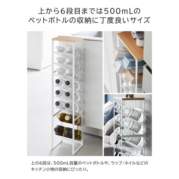 収納場所に困るボトルを一括収納!スリムに収納できる天板付きの大容量縦型ボトルストッカー。ペットボトルや瓶類などの大きい物まで収納可能な8段の斜め棚。棚が斜めになっているのでボトルが取り出しやすく、天板には小物を置くことができます。下段棚には大きめのボトルも収納可能。リビングやキッチンなど様々な場所でお使いいただけます。