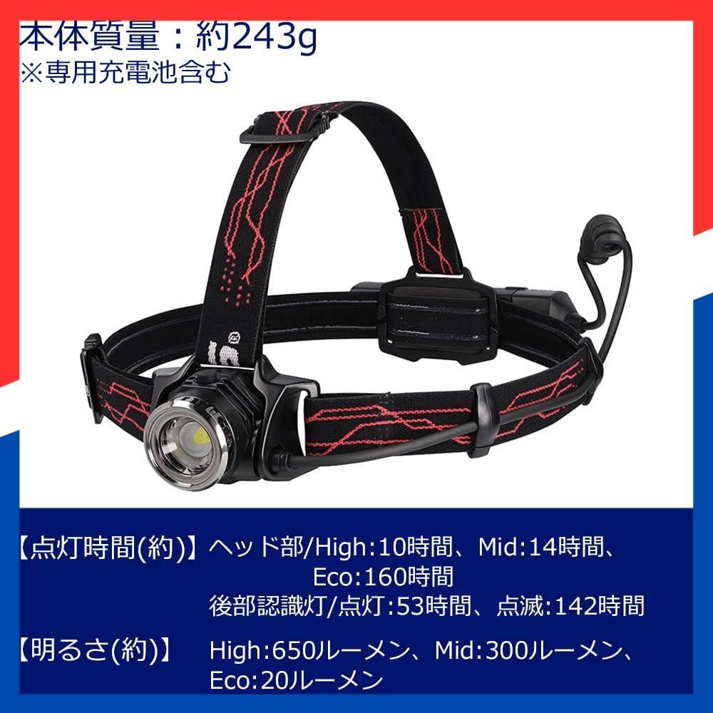 明るさ:High/650ルーメン、Mid/300ルーメン、Eco/20ルーメン、使用電池:専用充電池
