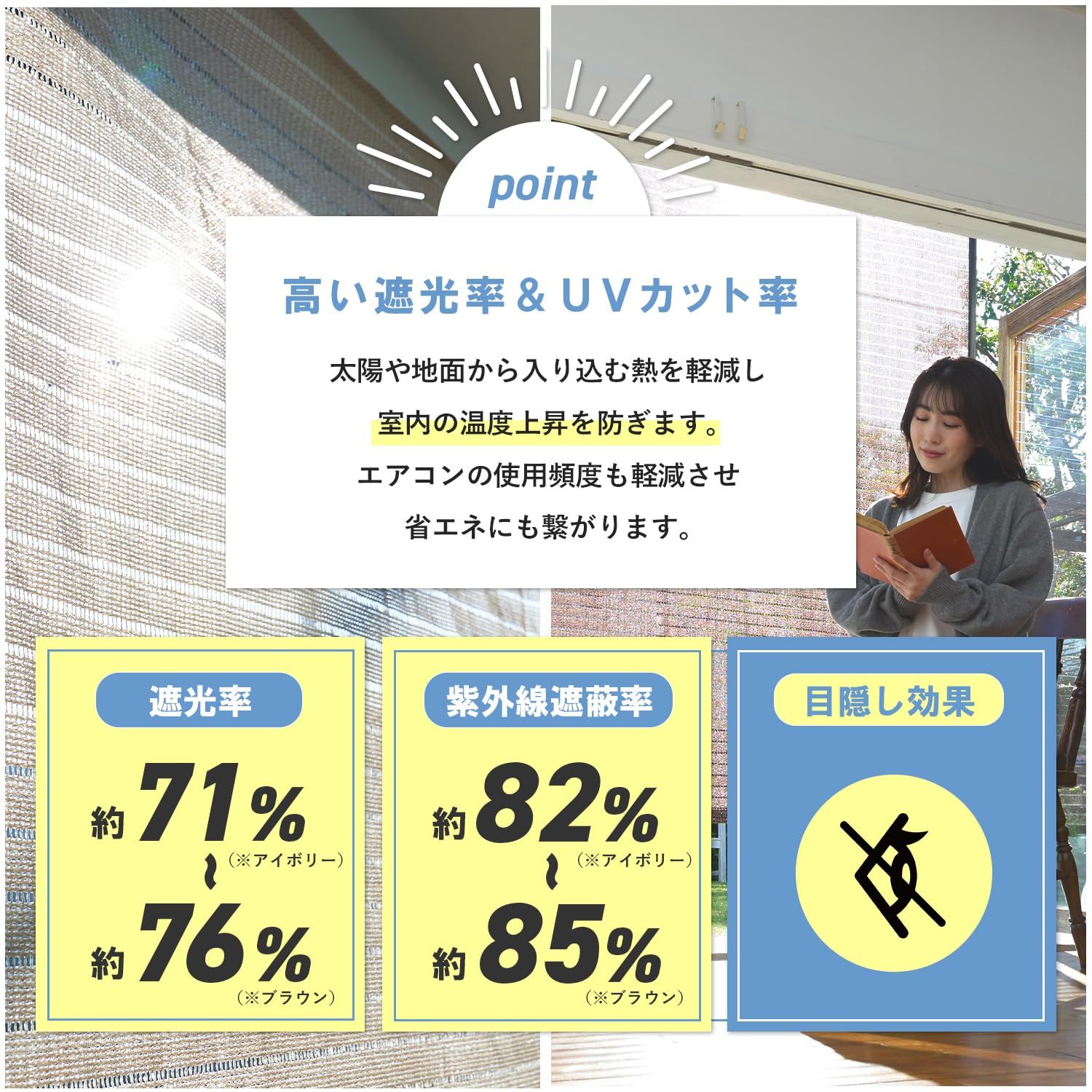 ●遮光率約76%で、近隣からの目隠し効果としても活躍します。ベランダでくつろぐ際に人の目が気になる方にもおすすめです。