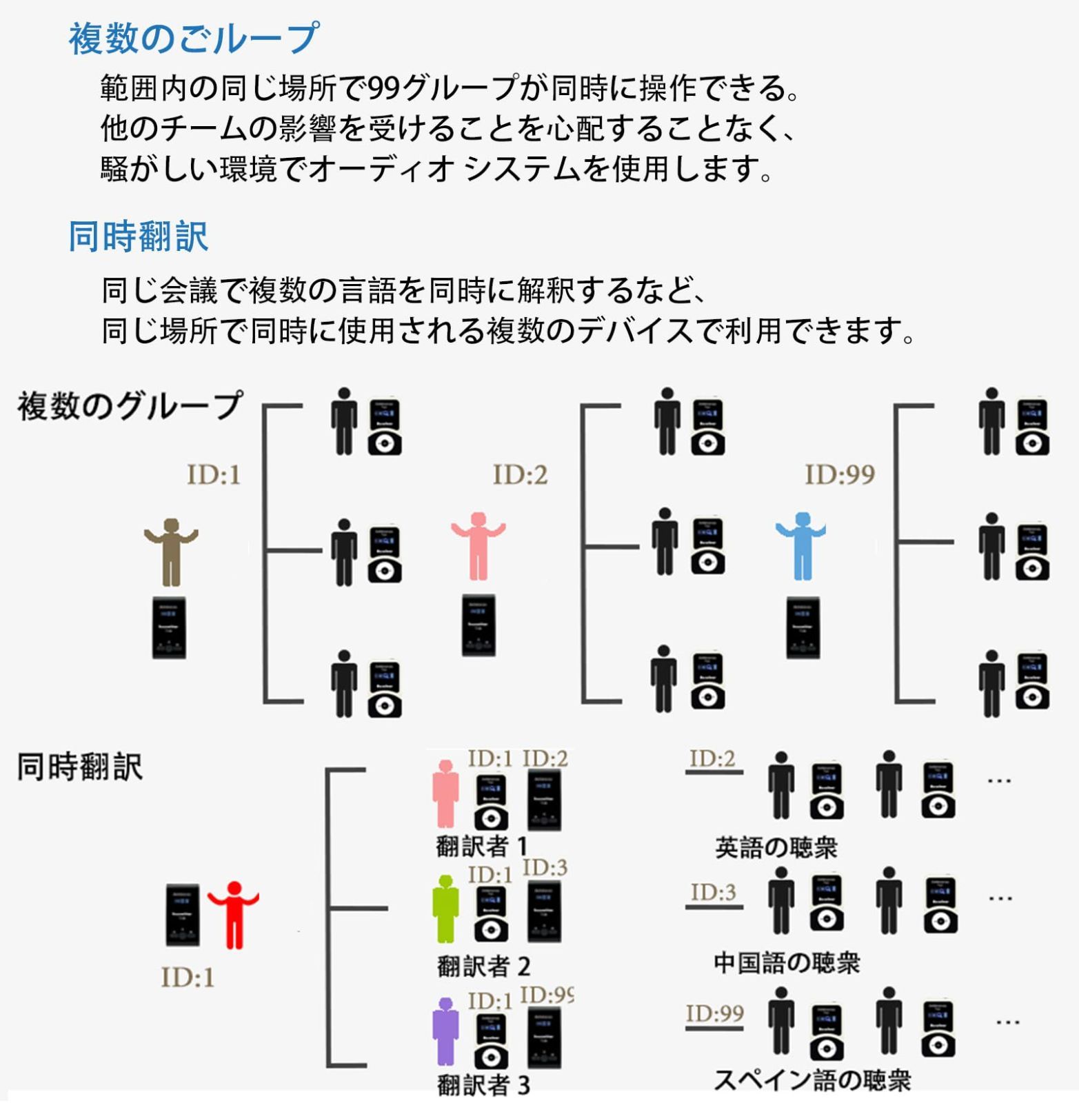 使用環境にもよりますが、見通し距離で約100m程度までカバーできます。市街地等の電磁波の多い環境での実効距離は50~60mが目安となります。通常のパッケージツアーの1グループ40名様程度であれば、充分な送受信距離があります。