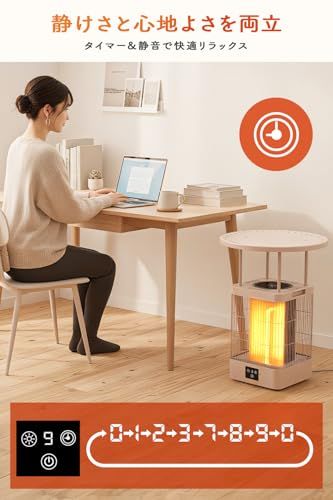 【静音・タイマー・リモコン、便利性を一台に集約】静かさにこだわり、運転音はほとんど気にならず、寝室での安眠や書斎での読書も快適に楽しめます。19時間の柔軟なタイマー機能を搭載し、あらかじめ温めたい時間を設定でき、省エネで安心。さらに 6メートルのリモコン操作 に対応しており、ソファでもベッドでも、指先ひとつでモードや時間を簡単に調節