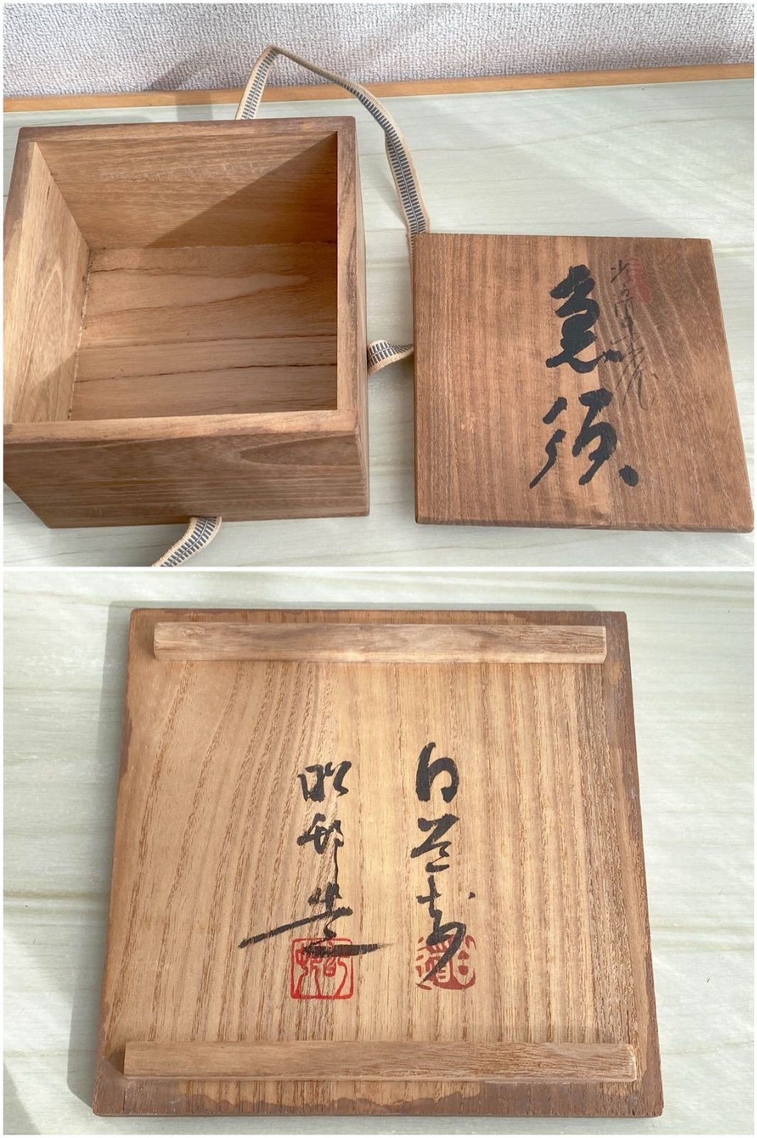 保管時の目立たない汚れと底面にわずかなスレが見られます。共箱が付属しますが、箱には傷や汚れがあります。