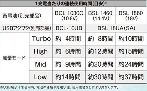 1充電当たりの使用時間(目安):[10.8V蓄電池BCL1030C、USBアダプタBCL-10UB]Turbo約4時間、High約6時間、Mid約9時間、Low約14時間・[14.4V蓄電池BSL1460、USBアダプタBSL18UA(SA)]Turbo約8時間、High約12時間、Mid約20時間、Low約30時間・[18V蓄電池BSL1860、USBアダプタBSL18UA(SA)]Turbo約10時間、High約15時間、Mid約24時間、Low約37時間