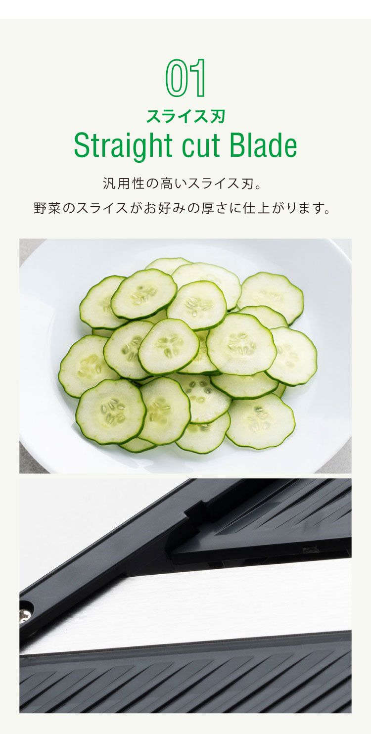 食材と料理に合わせてお好みの厚さで野菜をスライスできます。