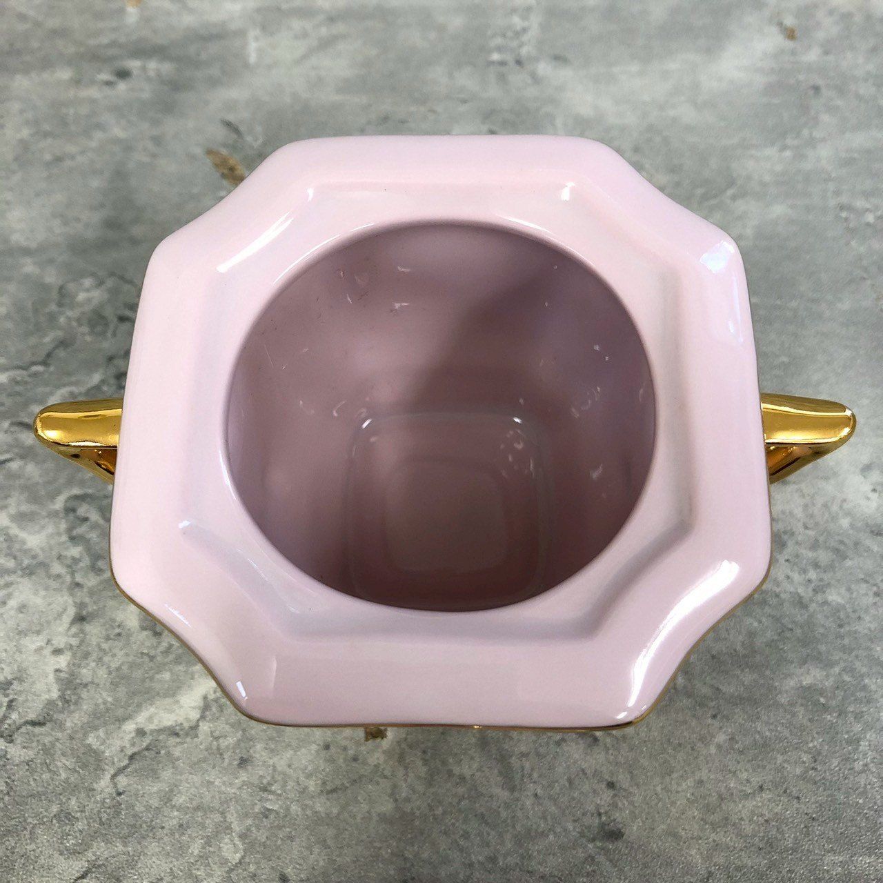淡いピンクの磁肌に、縁や装飾部分の金彩が映える気品あるデザイン。