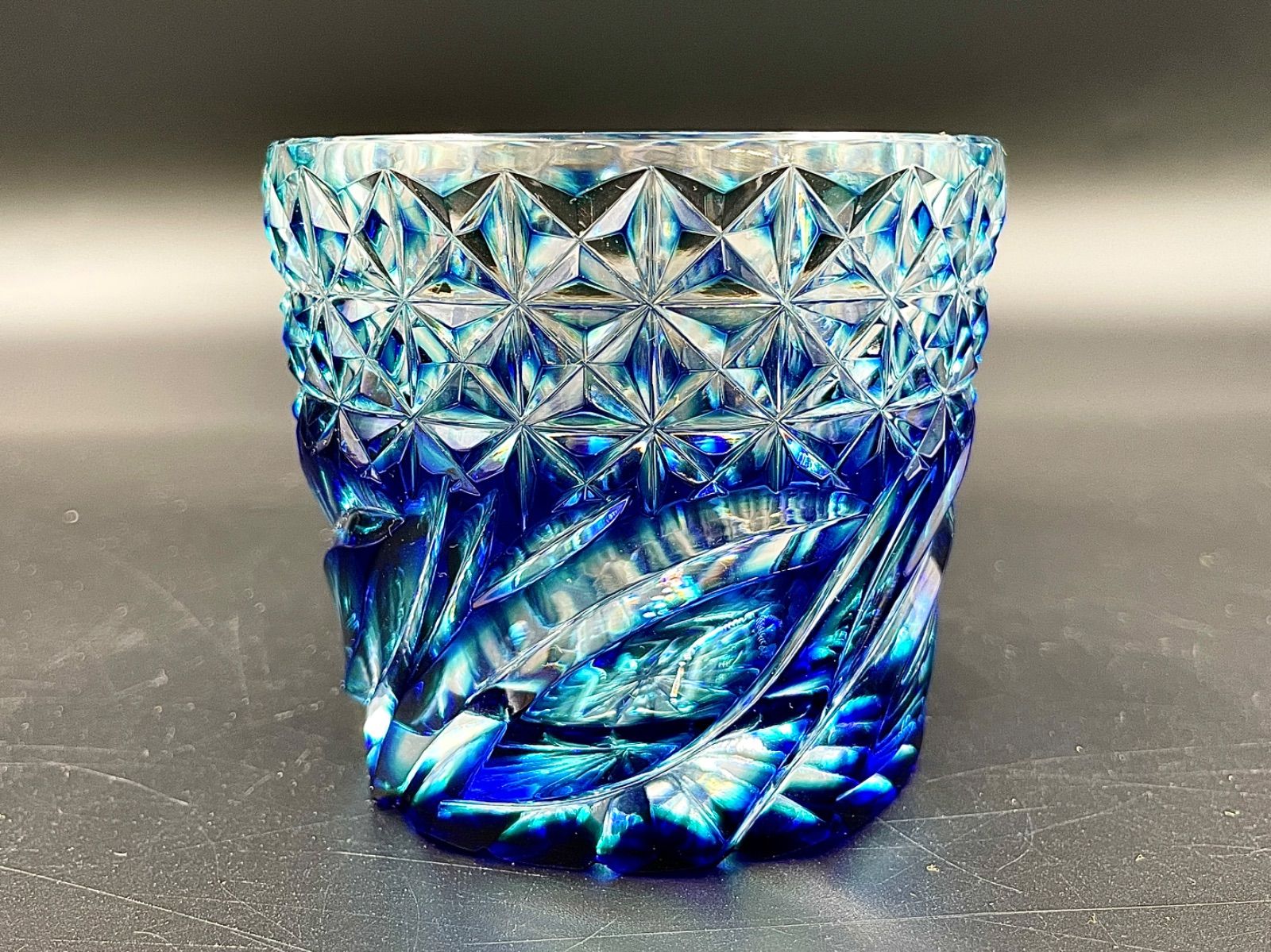 C 12071 薩摩びーどろ工芸 そば猪口 薩摩切子 緑 瑠璃 最 ハンドカット 二重被せ カットガラス 伝統 サイン入り