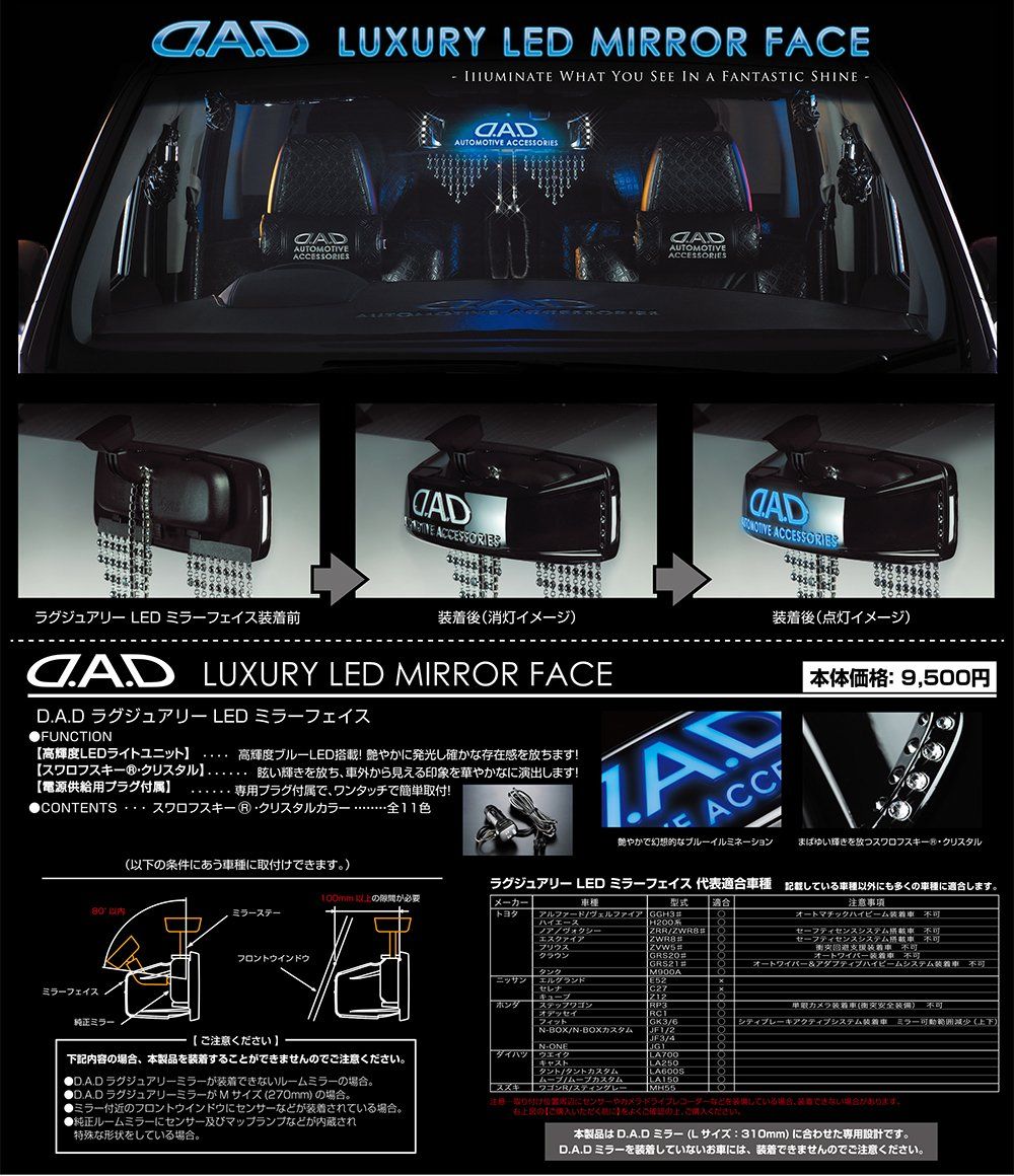 ※本製品は、D.A.D ラグジュアリーミラーのLサイズ(310㎜)対応商品となります。その他サイズのミラーや、純正ミラーには装着不可となっておりますので、ご注意ください。