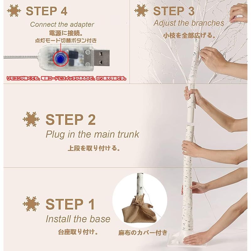 【サイズ】サイズは60cm・120cm・150cm・180cmの4サイズ展開で、お部屋やお庭に合うサイズをお選びいただけます。ご注意:120cm/150cm/180cmはもう一度デザインされて、ACアダプター一体型からUSB式に変わりました。USB式はもっと通用で、モバイルパワー、デスクトップPC、ノートパソコン、USB充電器、ACアダプターなど、等へ接続できます。これから全部USB式となります。 60cm白樺 ツリーは単3×3本(AA)電池が必要です(電池が含まれません)