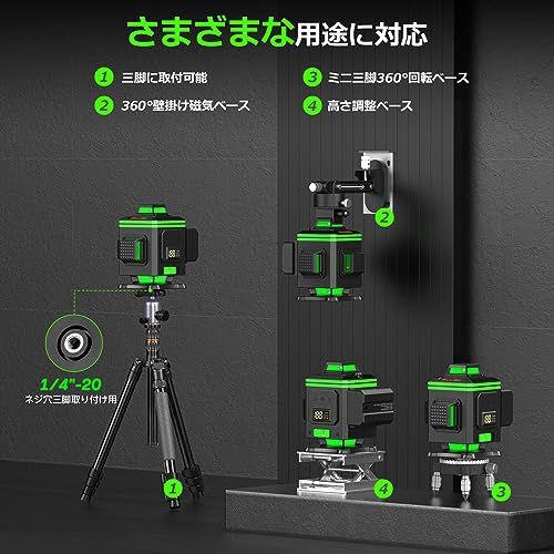 【2025 年最新改良の高精度16ラインレーザー墨出し器 R16】改良点:他の墨出し器とは異なり、本体には電量を表示するLCD ディスプレーが搭載されています。作業中のバッテリー残量が一目でわかり、電池切れの心配がありません。改良点:360回転可能な金属ベースを備え、レーザー線と正確な目盛りを参照しながら、機器を全方位に回転させることができます。作業の自由度が格段に向上します。改良点:2本の 360水平線と2本の360垂直線が組み合わされて、部屋全体をカバーします。赤色よりも視覚的に見やすいグリーンレーザーを採用し、明るくて正確な結果を簡単に得られます。レーザー基準はクラス2、1MW 以下で、家庭やオフィスで安全に使用できます。改良点:レーザーの明るさが無段階調節可能です。