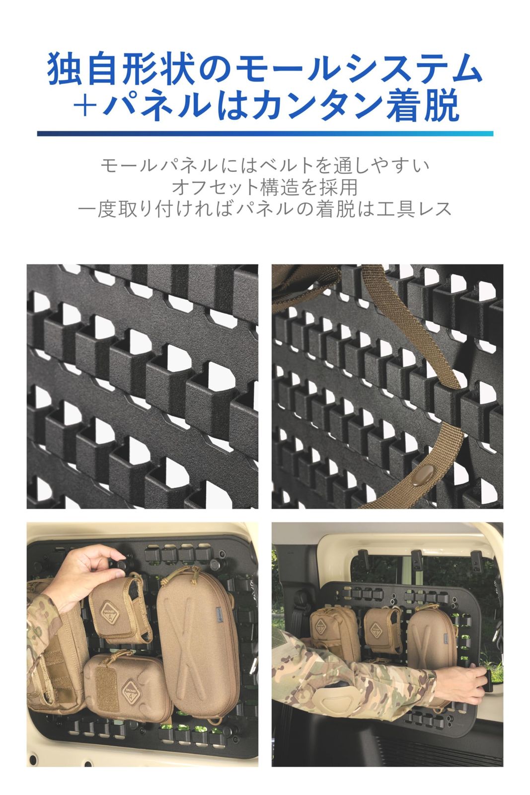 穴があいただけの平面モールパネルと異なり、モール対応アイテムのベルトを通しやすいオフセット構造を採用しております。