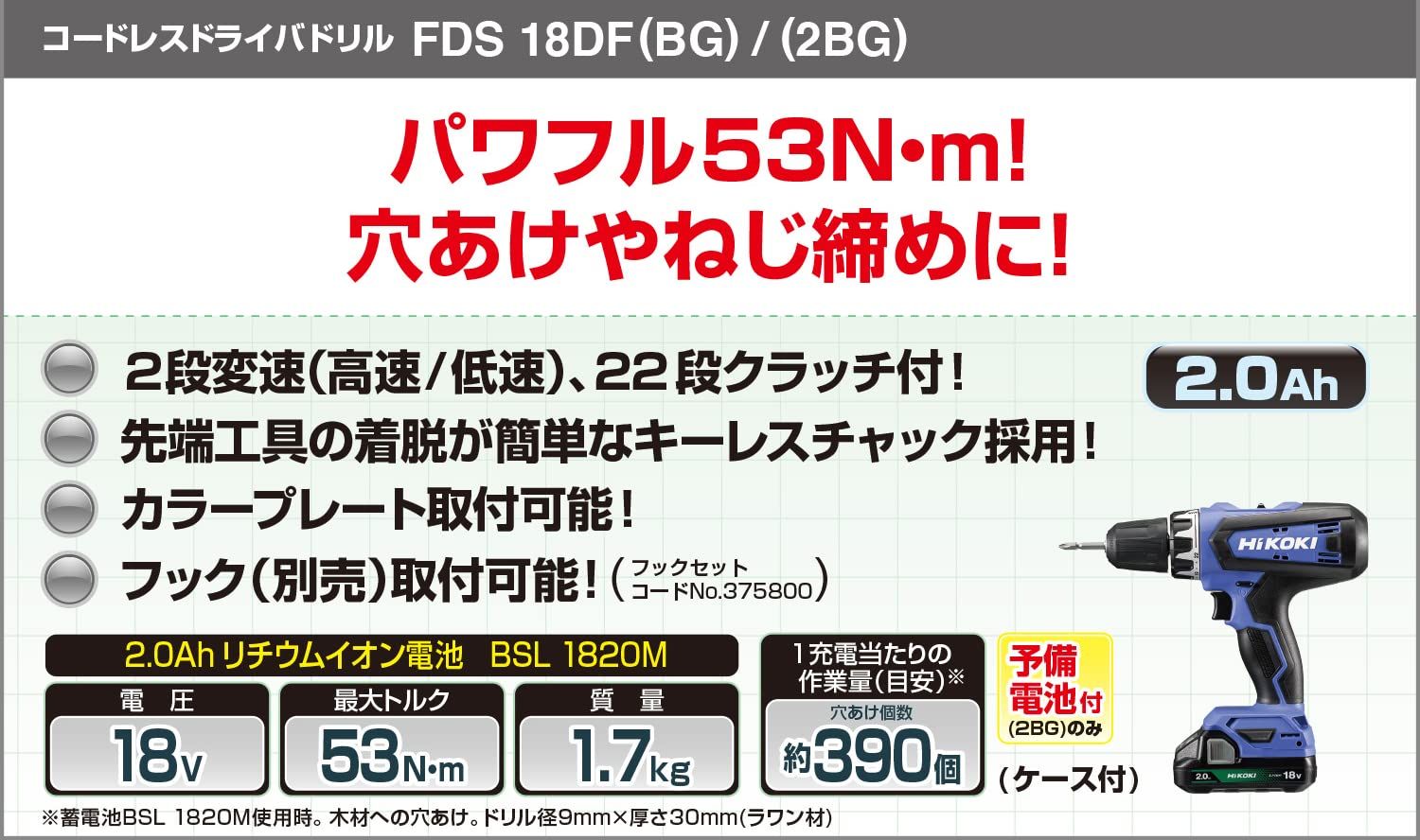 HiKOKI ハイコーキ 18 V コードレス ドライバドリル チャック 1 5 13 mm 22段クラッチ 2 0 Ah 蓄電池 充電器 ケース付 FDS DF BG