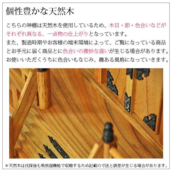 こちらの神棚は天然木を使用しているため、木目・節・色合いなどがそれぞれ異なる、一点物の仕上がりとなっています。