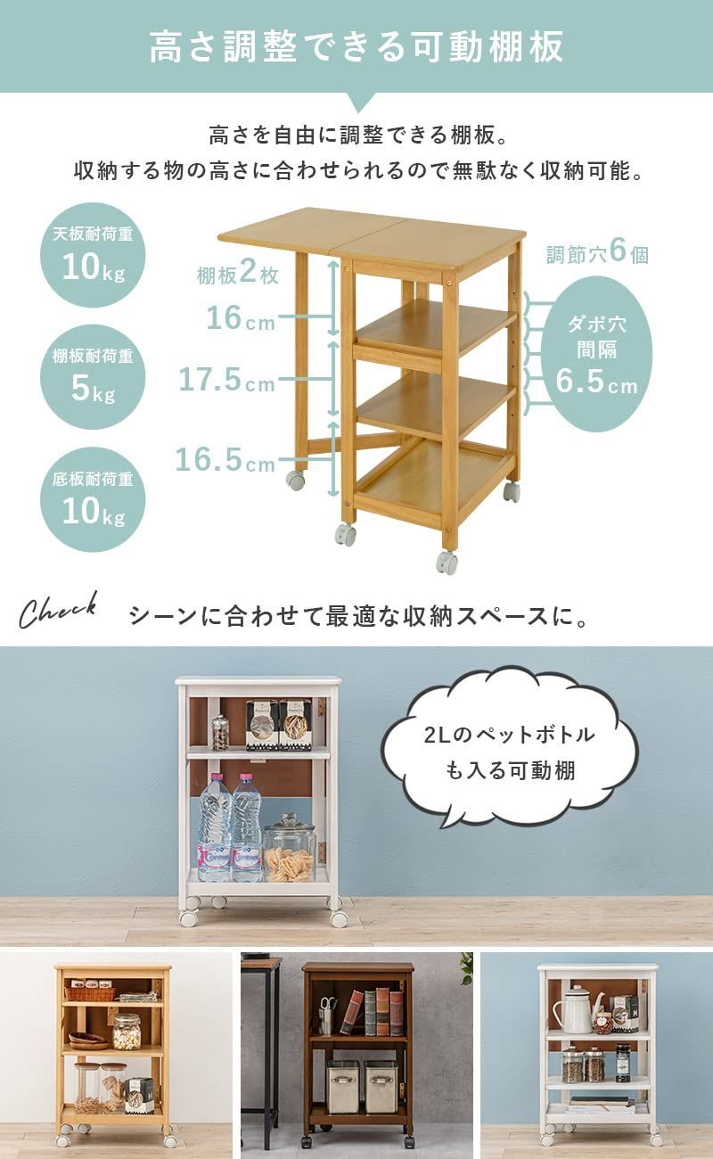 キッチン キッチンワゴン 収納 棚 ストッカー バタフライテーブル 拡張天板 可動棚 キャスター付 頑丈 萩原 Hagihara シンプル スリム 幅70 奥行45 高さ71 ホワイト 1台入り VW 7984 WS