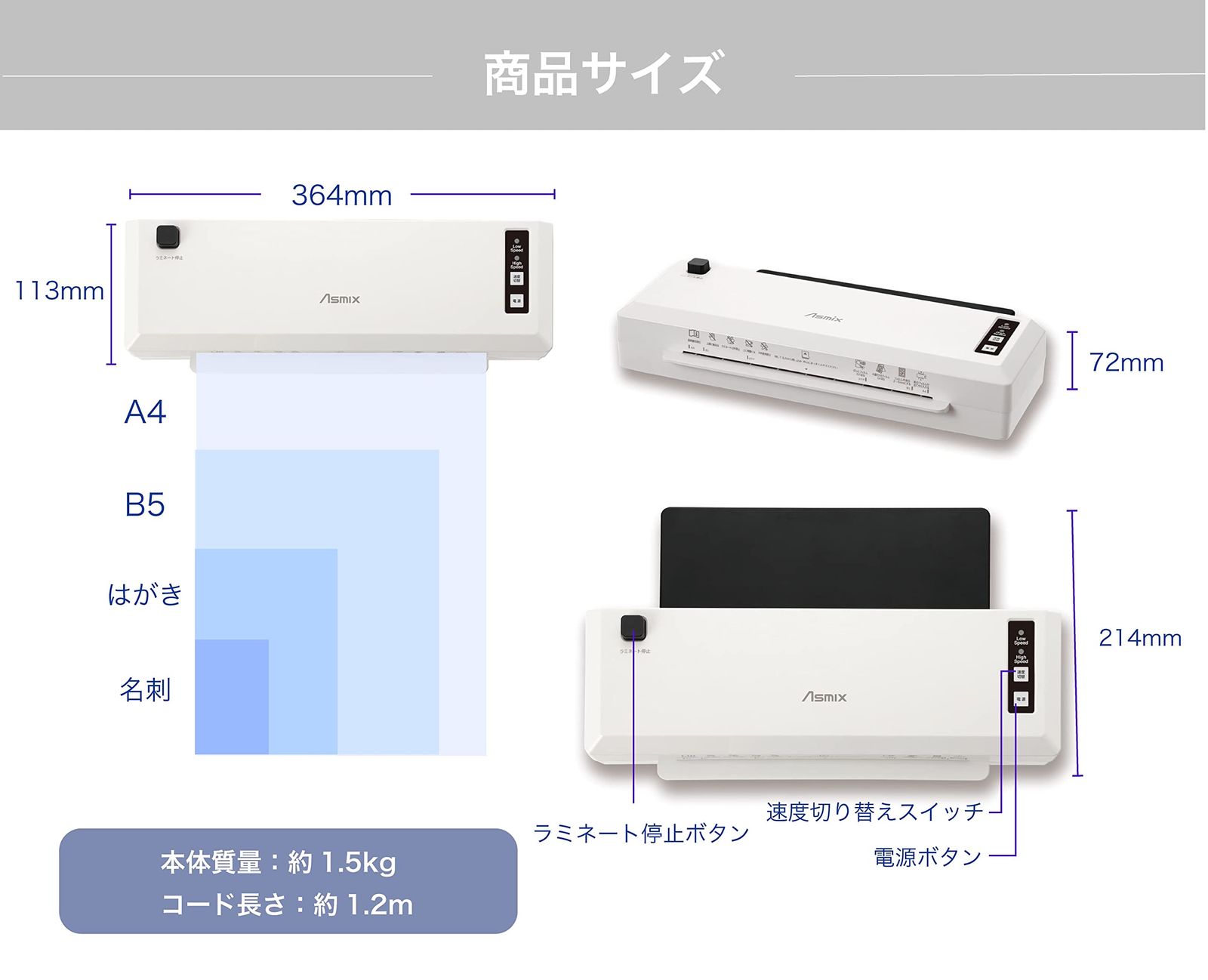 操作機能:電源スイッチ、速度切り替えスイッチ、ラミネート停止ボタン