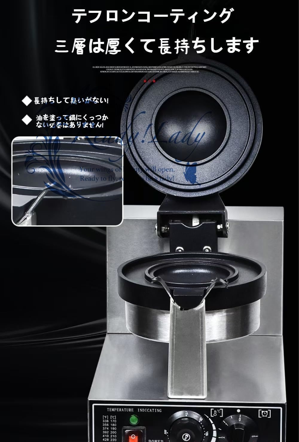 【業務用ワッフルメーカー】:ベーキングトレイは、高度なノンスティックコーティングと高い熱伝導率を備えた鋳造アルミニウム製です。本体はステンレス鋼で作られており、頑丈で耐久性があり、高温に強く、変形しません。