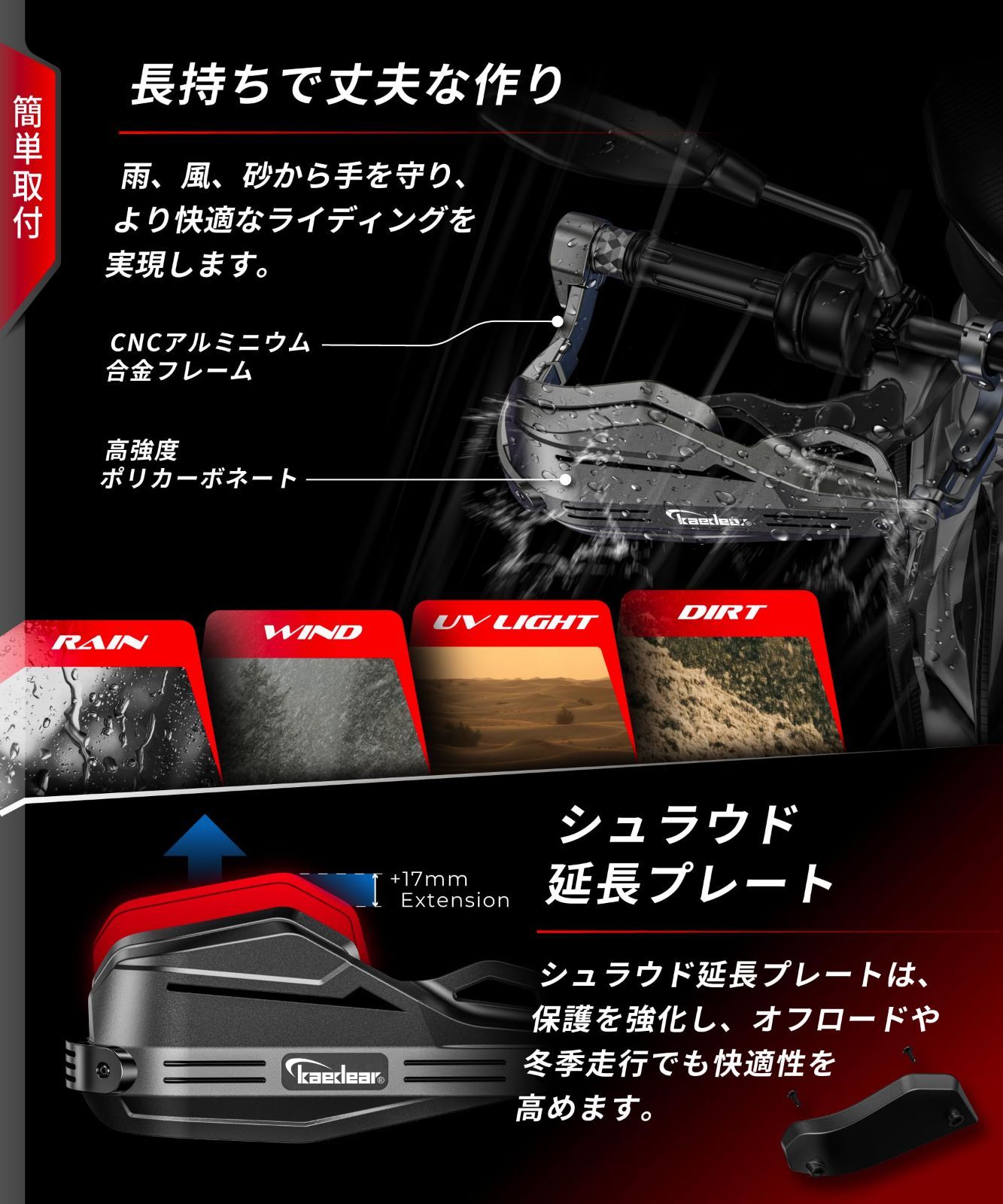 Kaedear(カエディア) バイク ナックルガード ハンドガード 防塵 防風 防寒 ハンドル ガード アルミ プロテクター バーエンド 汎用 中型 大型 オフロード スクーター不可 OVERGUARD オーバーガード KDR-HSZ2