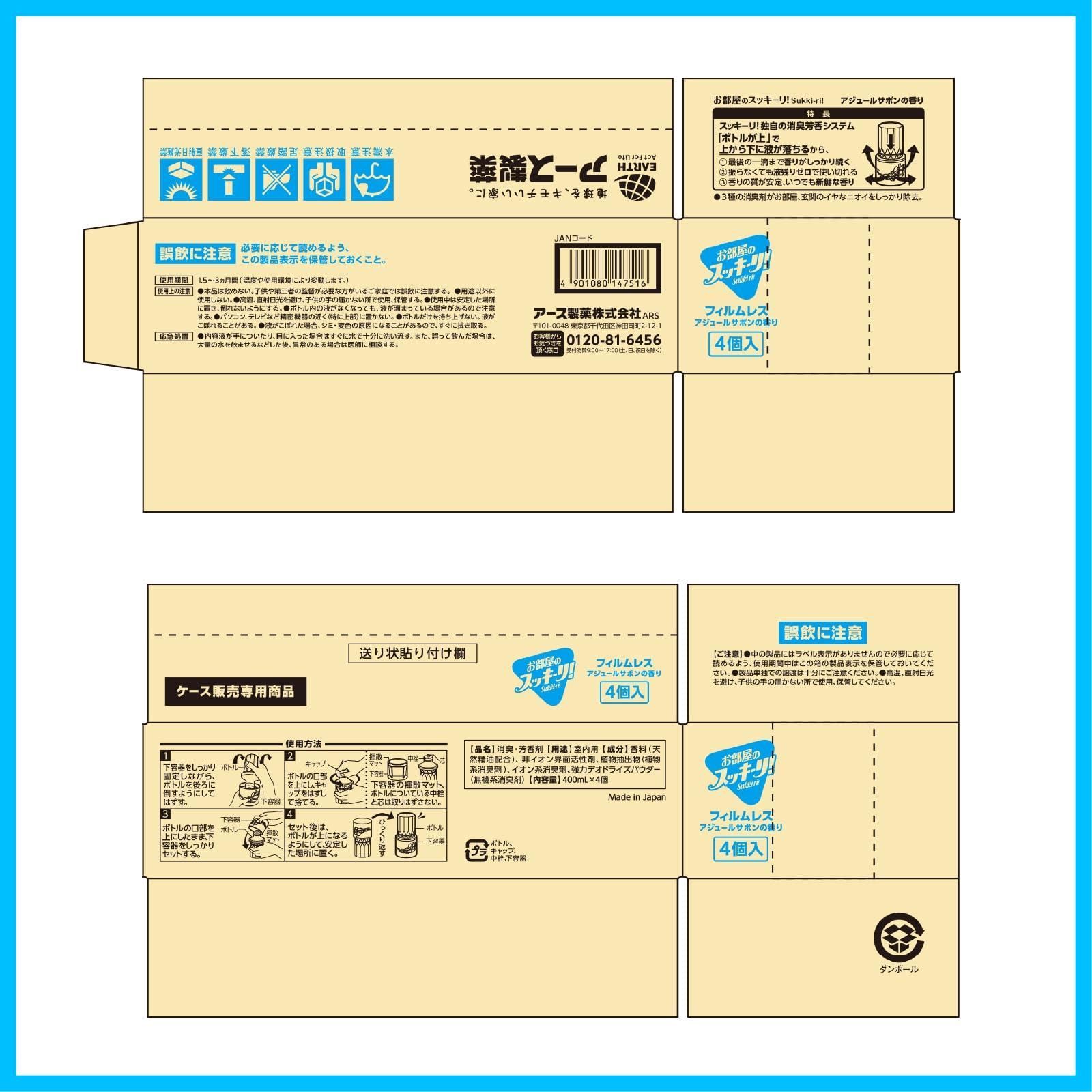 スッキーリ!Sukki-ri! お部屋のスッキーリ! お部屋用 消臭剤 芳香剤 フィルムレス アジュールサボンの香り [400ml×4個入] 最後の一滴まで香りが続く