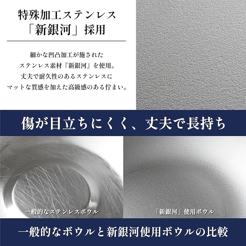 【素材と形状にこだわったボウル】細かな凹凸加工が施されたステンレス素材『新銀河』を使用。丈夫で耐久性があり撹拌時に付くキズも目立ちにくくお菓子作りなどにも