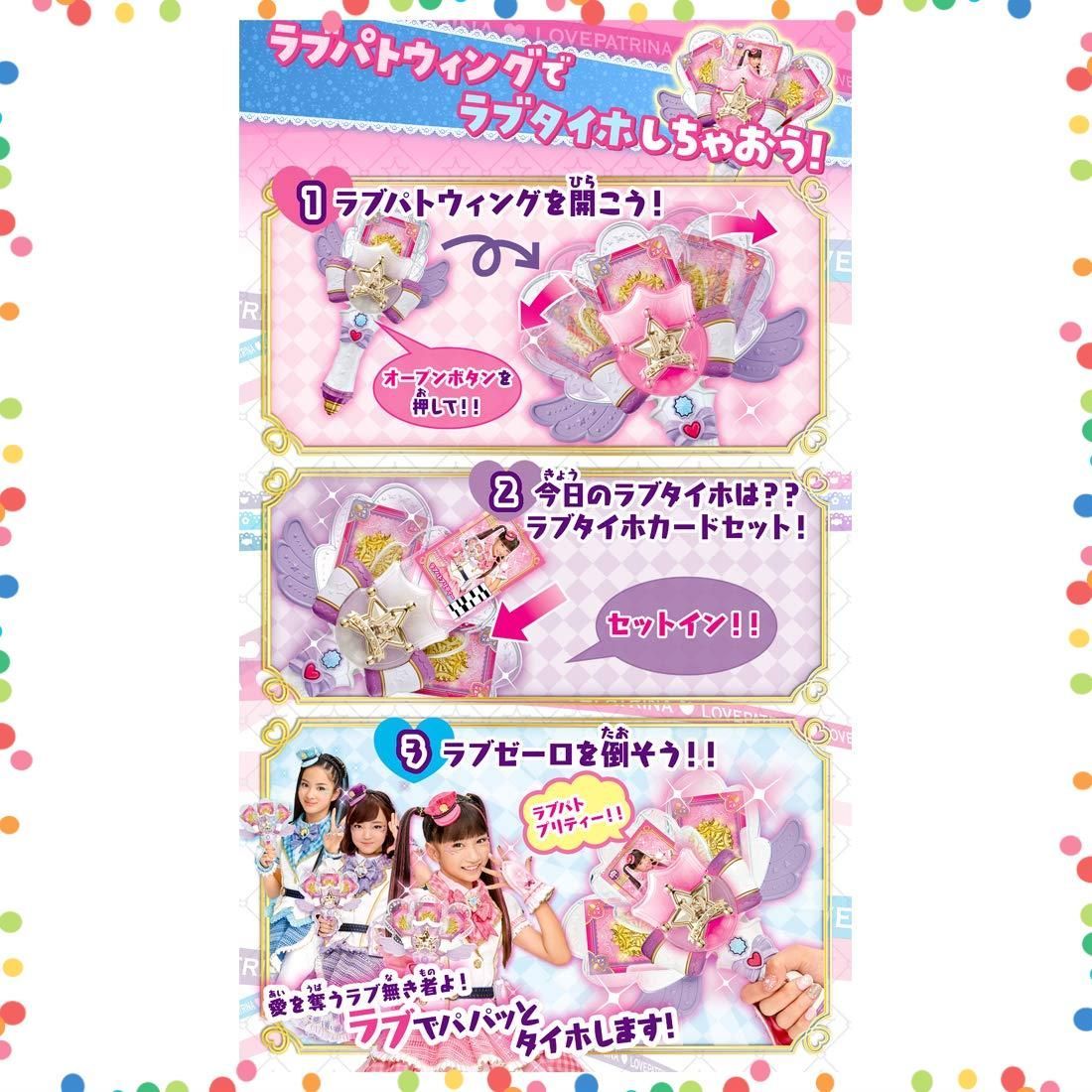 【セット内容】ラブパトウィング(1)ラブパトプリティーカード(ツバサ)(1)ラブパトプリティーカード(サライ)(1)ラブパトドリーミーカード(サライ)(1)ラブパトハッピーカード(コハナ)(1)ラブパトピースカード(ツバサ)(1)ラブパトピースカード(コハナ)(1)取説(1)