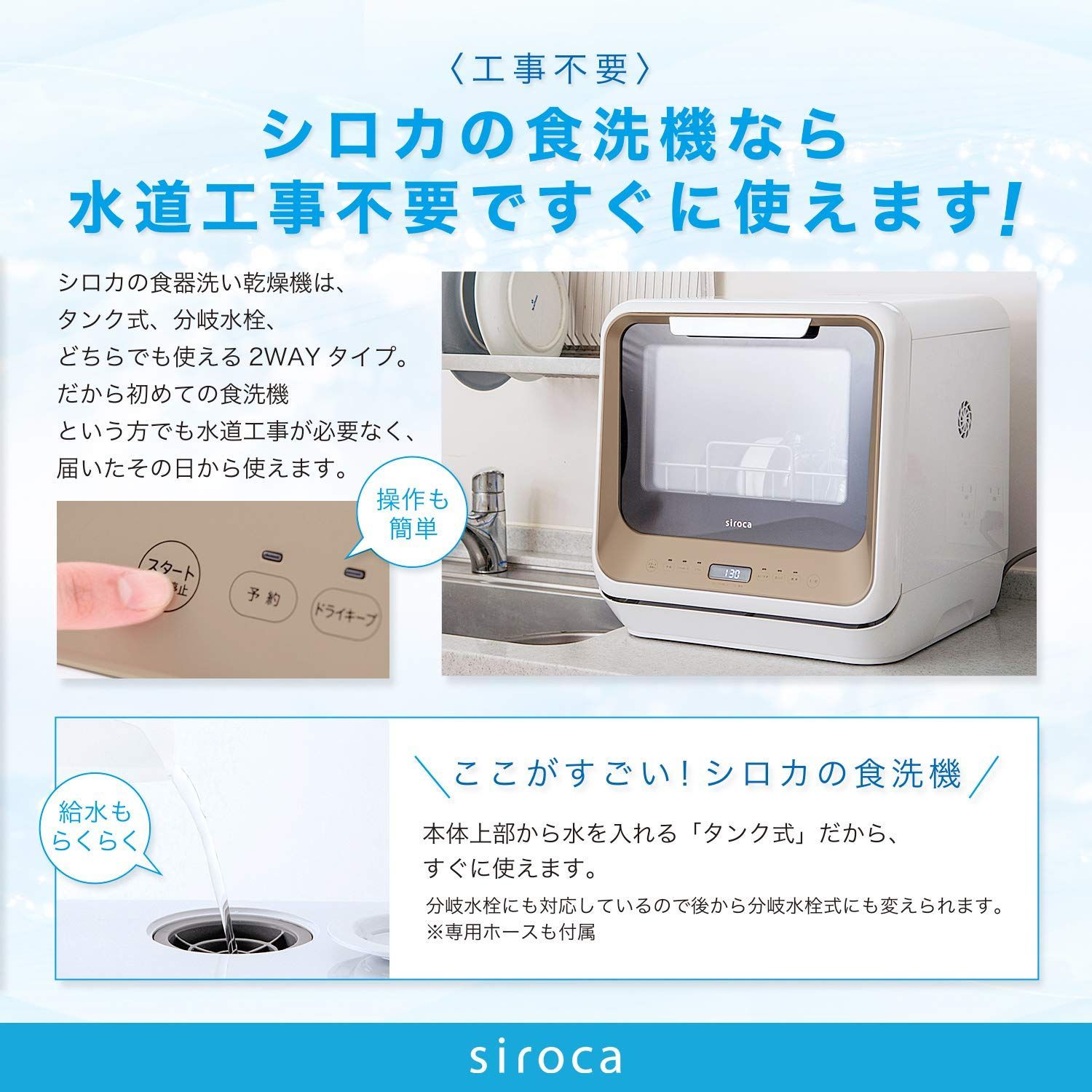 シロカ 2 WAY食器洗い乾燥機 食洗機 工事不要 分岐水栓対応 液晶表示付き タイマー搭載 360℃キレイウォッシュ PDW 5 D ゴールド