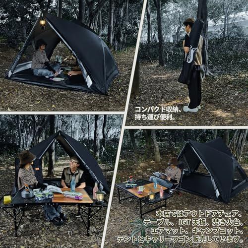 【四方向に大きく広い窓を設置し、四季に対応】190cm x 150のスペースで、2人が寝転がったり座ったりしても非常に快適です。テントの天井は125cmに高くなっており、圧迫感や蒸し暑さを効果的に軽減します。【四面からの循環通風で、蚊や虫を防ぎ、春夏に適しています】暑い夏により通気性が良く、蒸し暑さを防ぎ、遠くの景色をよりよく眺めることができます。蚊や虫の侵入を防ぎ、キャンプをより安全にします。【閉じた窓とトップカバーで、密閉性と保温性が最高に達し、秋冬に適しています】プライバシーを守り、雨水の侵入を防ぎ、秋冬のアウトドアキャンプをより暖かくします。【アップグレードされたファイバーフレーム】:強靭な耐風フレームで、56級の強風に耐えることができます。