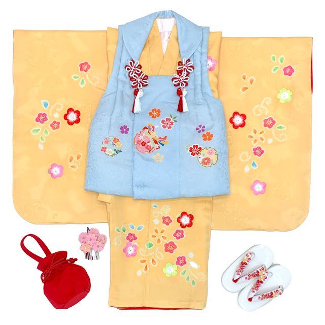 七五三 着物 3歳 正絹 フルセット 女の子 友禅 本絞りの着物 被布セット 水色x黄色 雪輪と桜 w bBset