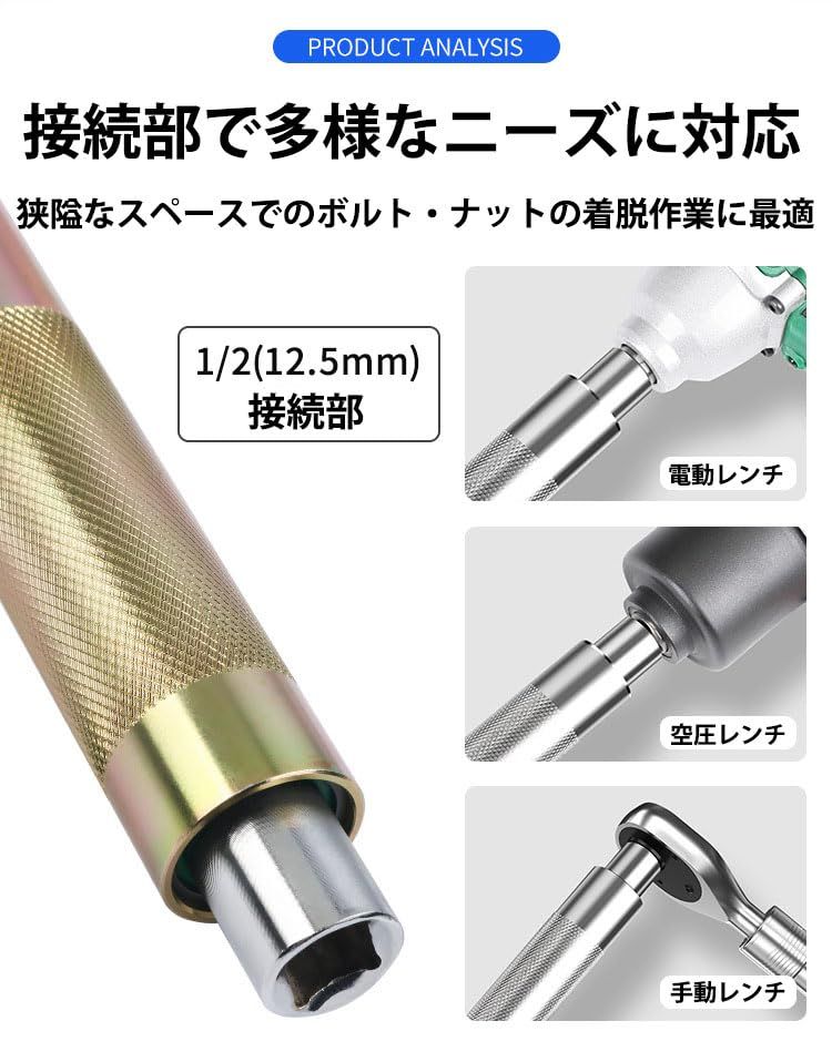 【多機能対応】1/2 (12.5mm) 接続部を採用し、電動レンチ、空圧レンチ、手動レンチと自由に組み合わせて使用できる多機能性。あらゆるメンテナンスシーンに柔軟に対応し、作業者のニーズに合わせた最適な作業環境を提供します。