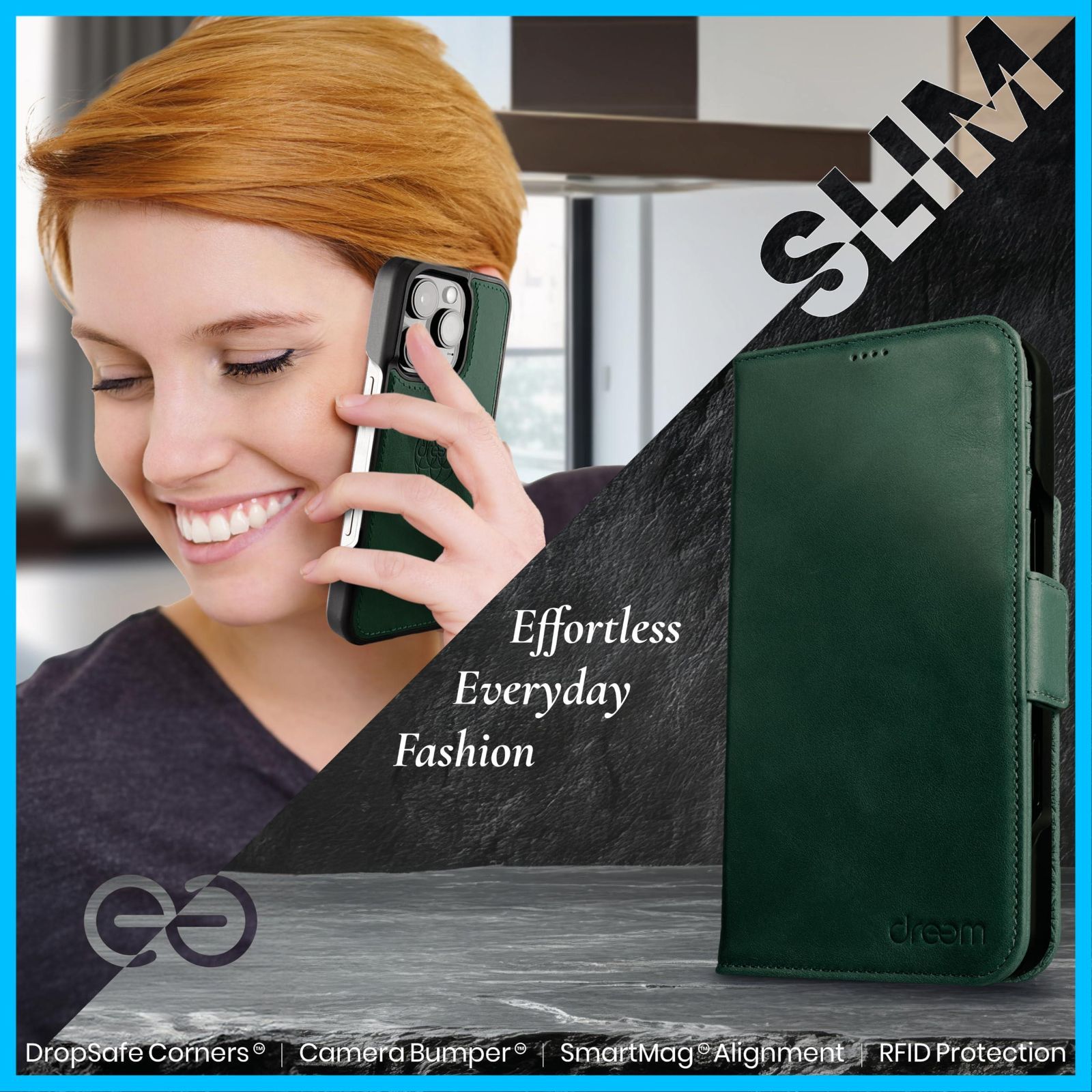 Dreem フィボナッチ(Fibonacci)2イン1 財布型ケース Apple iPhone 16 Pro Max用 - 高級ヴィーガンレザー製 マグネット着脱式 耐衝撃 携帯電話ケース RFIDカード保護機能 2通りに使えるフリップスタンド付き - [グリーン]