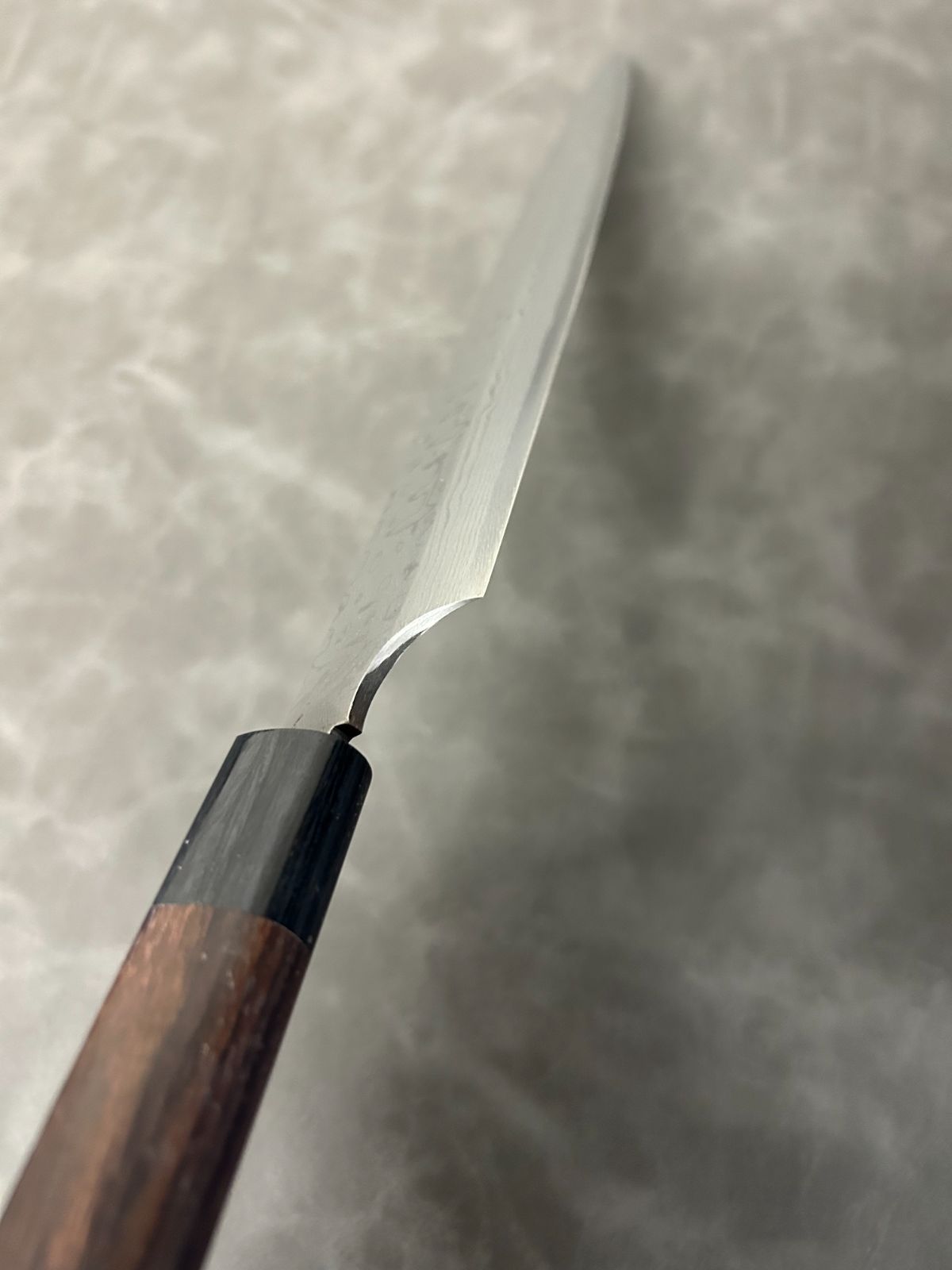柄は紫檀シノギを使用しており、10層のダマスカスで見た目が美しい和包丁に仕上がりました。