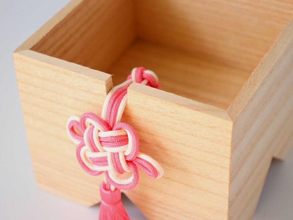 高級感がある桐の三宝(お供えをする台)の中に、白い二段のお餅と飾り紐、橙が入れ子になって収納されています。桐箱の蓋を返し、箱にのせていただくと三宝になります。大きな餅、小さな餅、橙の順に重ねると鏡餅が完成。橙は、木製の身に絹の唐打紐で「亀結び」をした縁起の良いデザイン。また、三宝に取りつける飾り紐も、延命長寿の象徴として用いられる「菊結び」になっていて、どちらもお正月にふさわしいおめでたいお飾りになっています。
