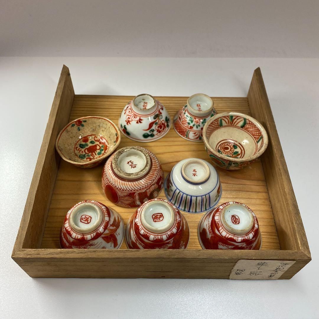 時代 九谷焼 犬山焼 赤絵盃9客セット 直径5 4 6㎝ 蓋無木