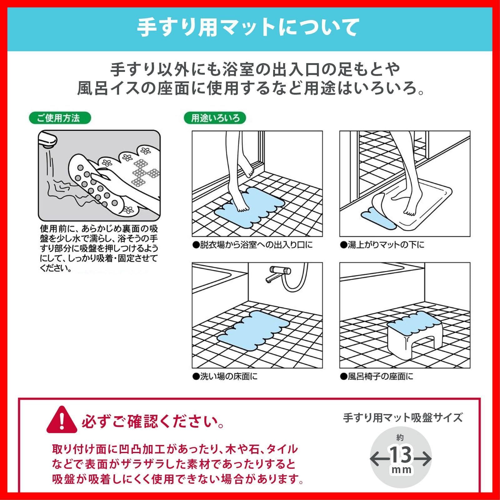 【商品仕様】▼セット内容:浴そうマット×1、手すりマット×1 ▼サイズ:(浴そうマット)約35×76cm (手すりマット)約20×28cm ▼材質 天然ゴム ▼耐熱温度:約70℃ 【ご使用にあたって】あらかじめ裏面の吸盤部を少し水で濡らして、浴槽に押しつけるように吸着させてください。浴槽にお湯をはる際は、なるべく弱い水流にしてください。(水流が強すぎると、吸盤がはがれる場合があります。)