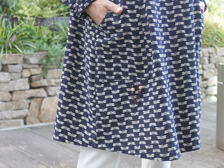 051204 15 4とんぼ 安曇野 F ゆったり 婦人服 大きい 11号~13号相当 藍染め風 和柄 おしゃれ割烹着 久留米絣パッチワーク ホームウエア