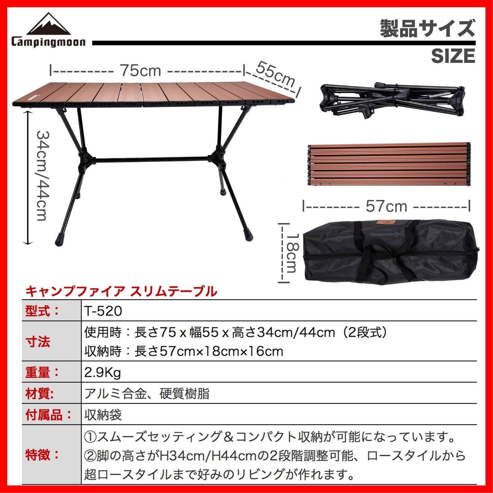 商品 スリムテーブル キャンプ ロールテーブル 折りたたみ式テーブル ロースタイル MOON 高さ2段階調整 キャンピングムーン CAMPING T 520 RD