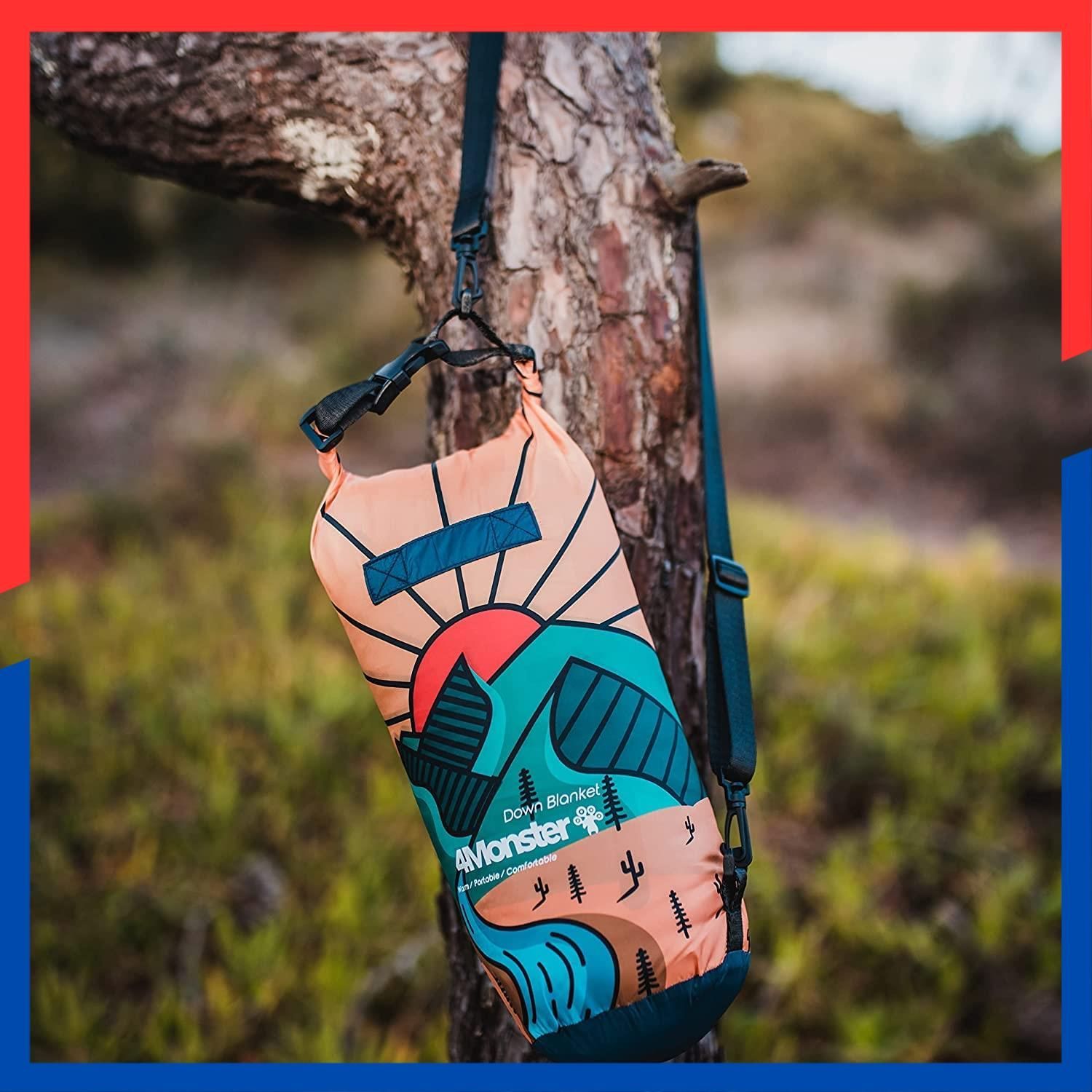 商品 ひざ掛け コンパクト 防風 肩掛け 防水 掛け布団 軽量 旅行 暖かい キャンプ 柔らかい アウトドア 防寒 収納袋付き マルチブランケット 春秋冬使用 ブランケット ダウン プリント 朝日 4 Monster