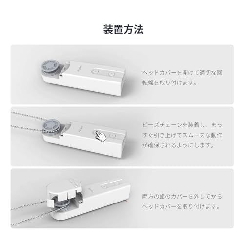 【取付け簡単】両面テープでもビスでも取り付けできます。1.ヘッドカバーを開け、適切なディスクを取り付けます。2.ビーズチェーンを装着して引き伸ばし、取り付け位置を確認します。3.スムーズに動作するか確認します。4.バックカバーを固定し、機器をバックカバーに取り付けます。5.2つの歯のカバーを取り外し、ヘッドカバーを再度取り付けます。(プラスチック/金属ビードの厚みが36mmのローラーブラインドにのみ使用可能)