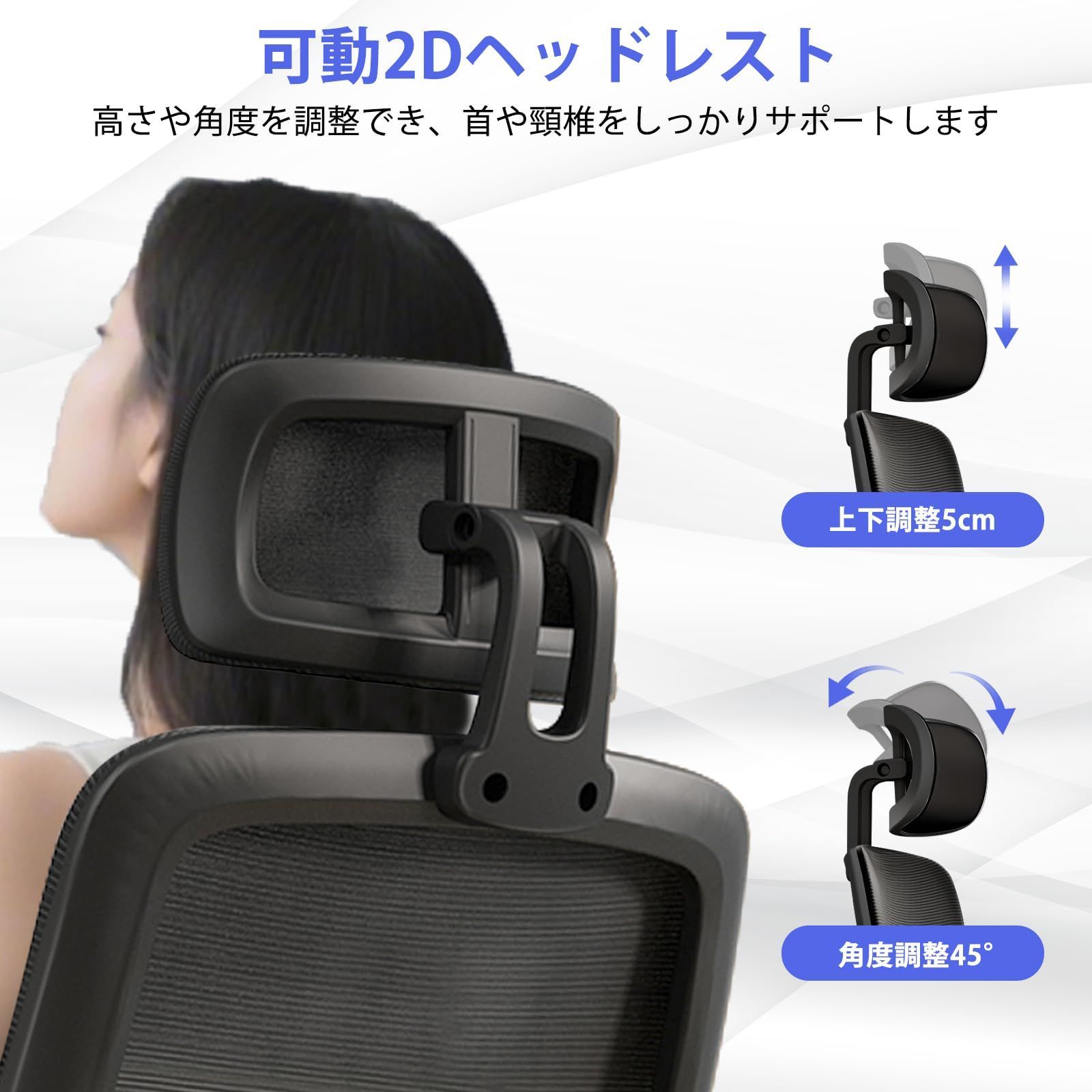 【可動式ランバーサポートとヘッドレスト】 人間工学に基づいたデザインで、ランバーサポートは上下3cm、前後3cmの範囲で自由に調整可能。可動式ヘッドレストは高さ6cm、角度45°調整可能。ユーザーの好みに合わせて最適な位置に調整できます、腰や首にぴったりフィットし、有効的に体の負担を分散して長時間座っても疲れにくいチェアです。