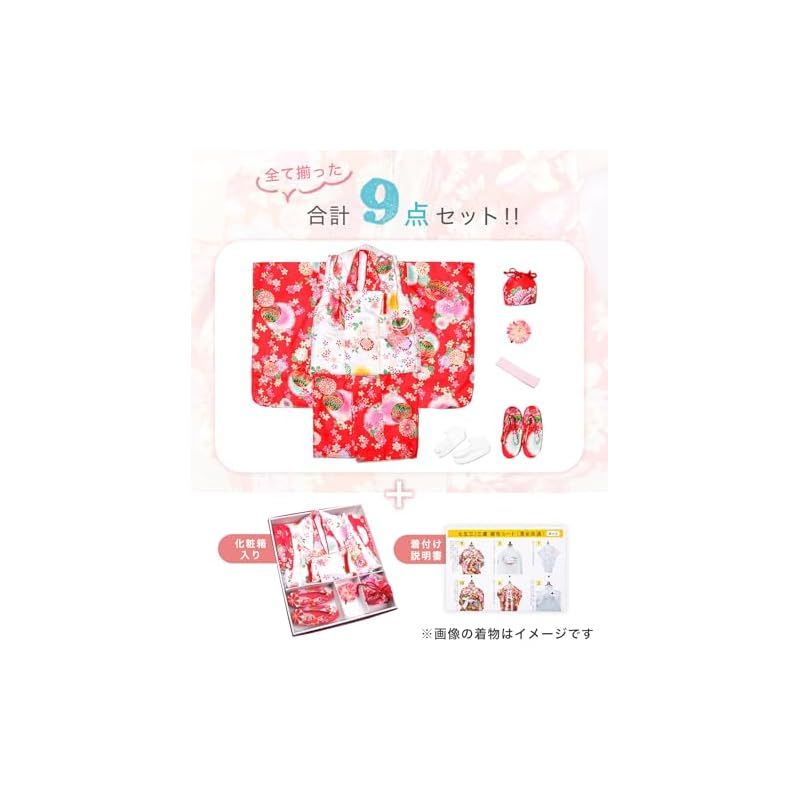 [セット内容]:被布/着物/伊達衿/長襦袢/髪飾り/巾着/草履/腰紐/足袋/専用化粧箱