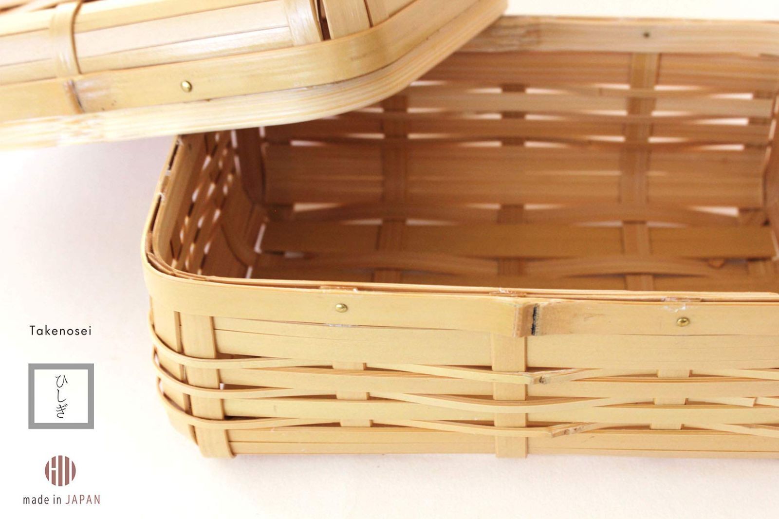 緻密に竹の本数を計算して作る「ひしぎ編み」と呼ばれる弁当箱。