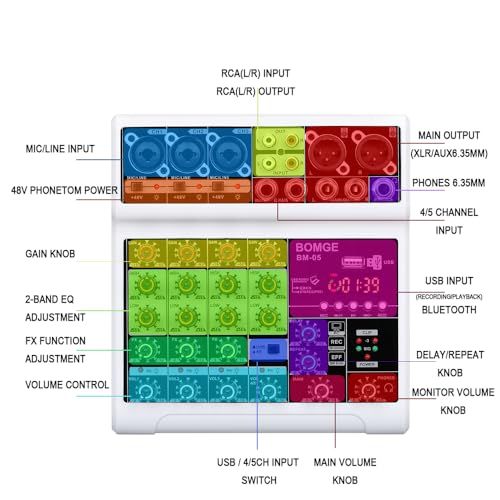 BOMGE オーディオミキサー サウンドボード ミキシングコンソール 5チャンネル デジタル USB Bluetooth エコー遅延効果 48 V Phantom Power ステレオDJミキサー 録音 ライブストリーミング ポッドキャ b 3 e 981 bd