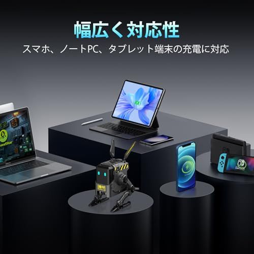 【ひと目でわかる充電状況】デバイスを接続すると「機甲の瞳」が自動で青く点灯。約5分後には安定した充電モードに切り替わり、ライトは消灯します。細部まで丁寧に作り込まれ、見た目の楽しさにもこだわった充電器です。※PD充電を行うには、PD対応のケーブルおよびPD対応デバイスをご使用ください。
