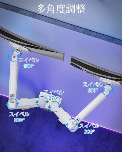 【多角度調整】チルト(上下傾き):上85/下45。スイベル(左右首振り):左90/右90。ピボット機能:回転360。高品質ガススプリング内蔵、より柔軟にモニターの角度を変更できます。回転機能も搭載されたし、画面の横縦の切り替えが手軽に行ないます。